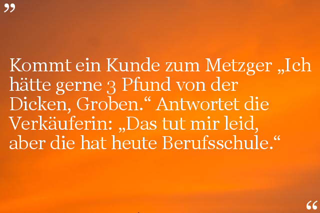 Kommt ein Kunde zum Metzger „Ich hätte gerne 3 Pfund von der Dicken, Groben.“ Antwortet die Verkäuferin: „Das tut mir leid, aber die hat heute Berufsschule.“