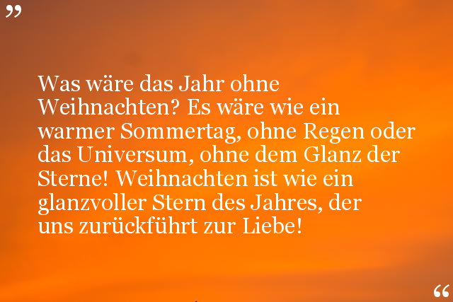 Was wäre das Jahr ohne Weihnachten? Es wäre wie ein warmer Sommertag, ohne Regen oder das Universum, ohne dem Glanz der Sterne! Weihnachten ist wie ein glanzvoller Stern des Jahres, der uns zurückführt zur Liebe!